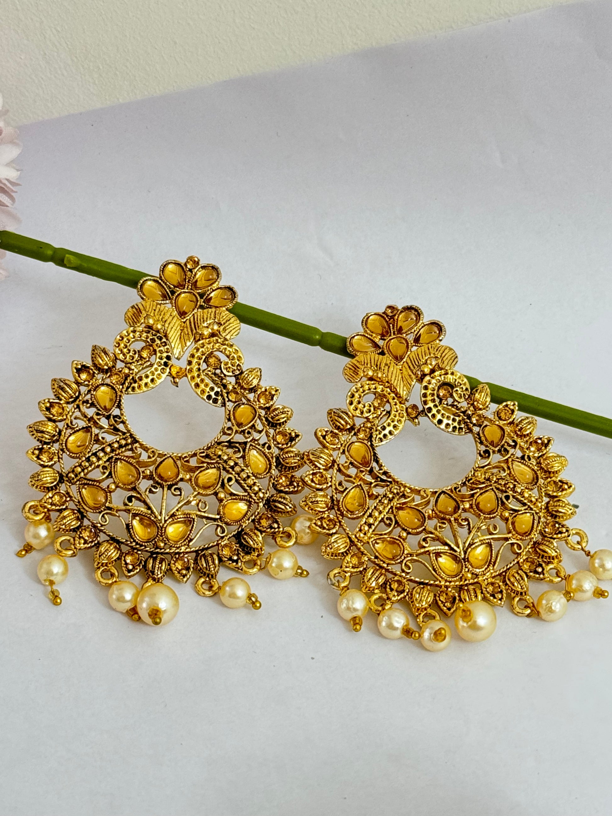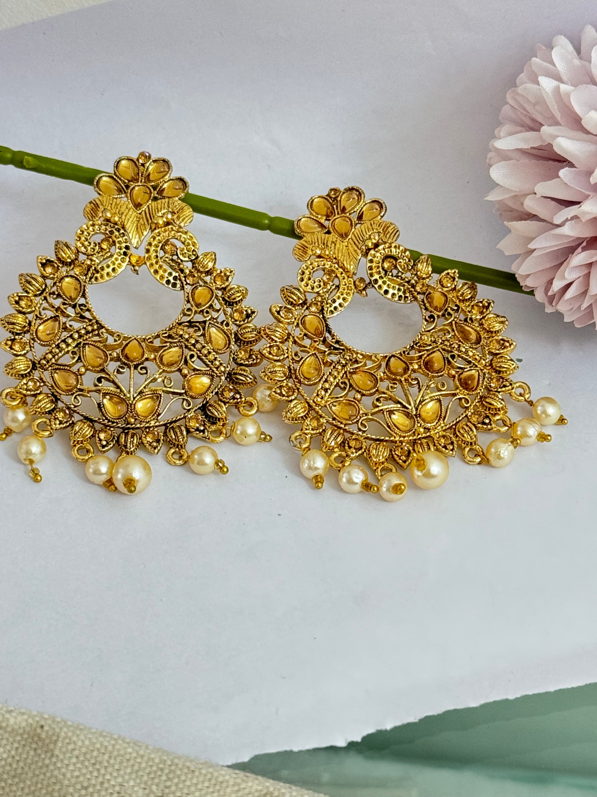 Elevate your festive look with our Ethnic Copper Golden Jhumka. Made from high-quality copper, this traditional jewelry piece adds a touch of elegance to any outfit. Enhance your traditional attire and embrace your cultural roots with our stunning Chandbali design.