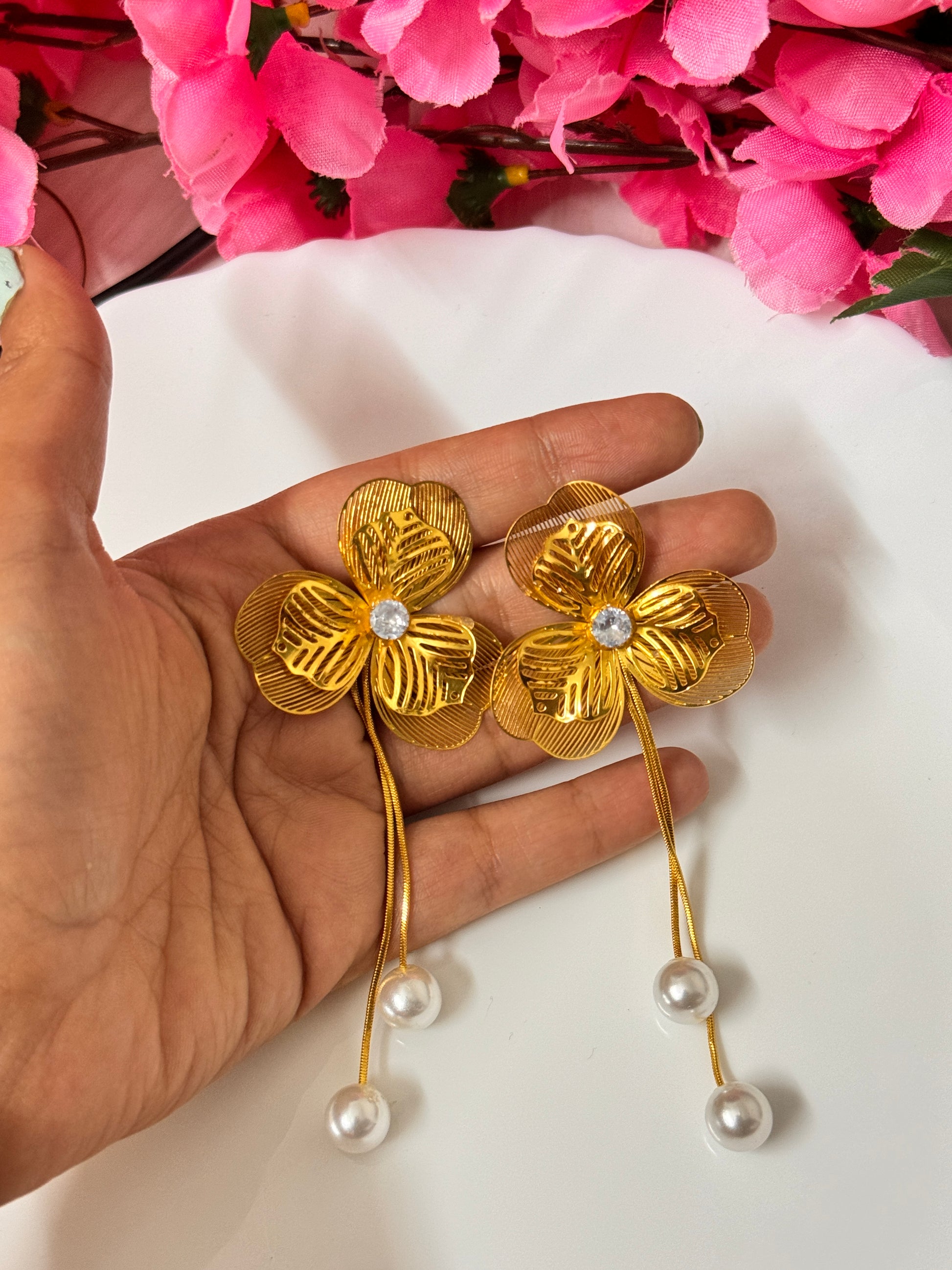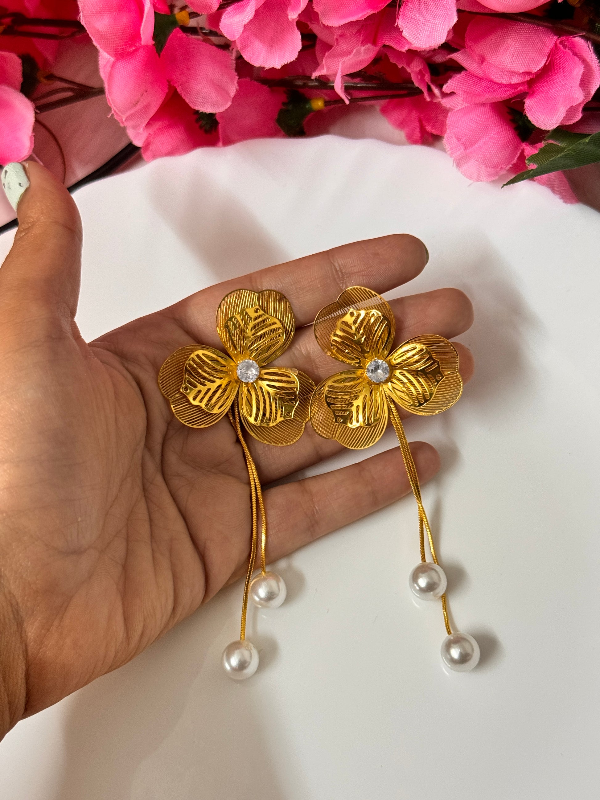Bring a touch of elegance to your wardrobe with our Flower Pearl Danglers. These danglers feature beautifully crafted flowers adorned with lustrous pearls, adding a feminine and delicate touch to your outfit. Elevate your style with these stunning accessories.