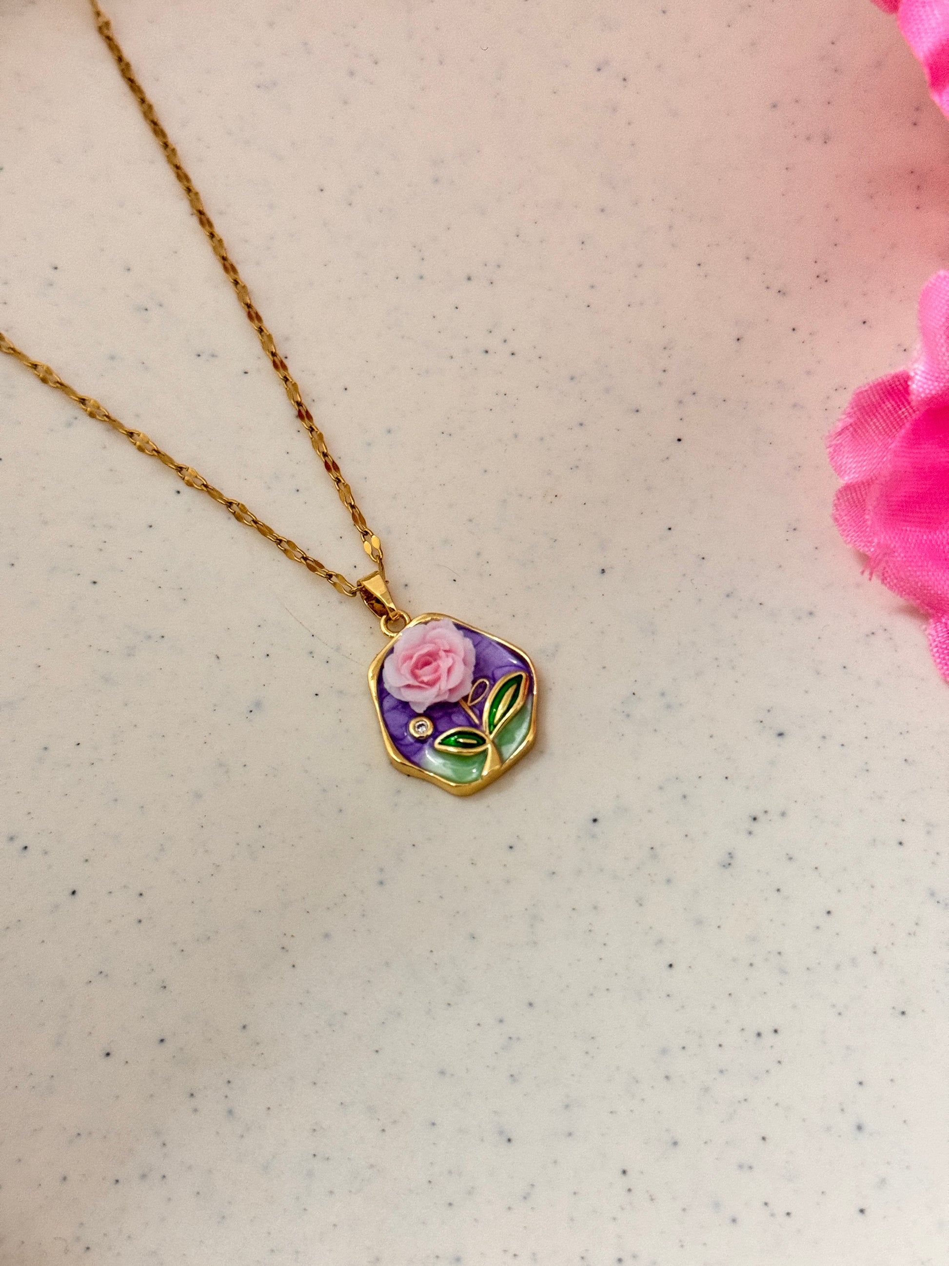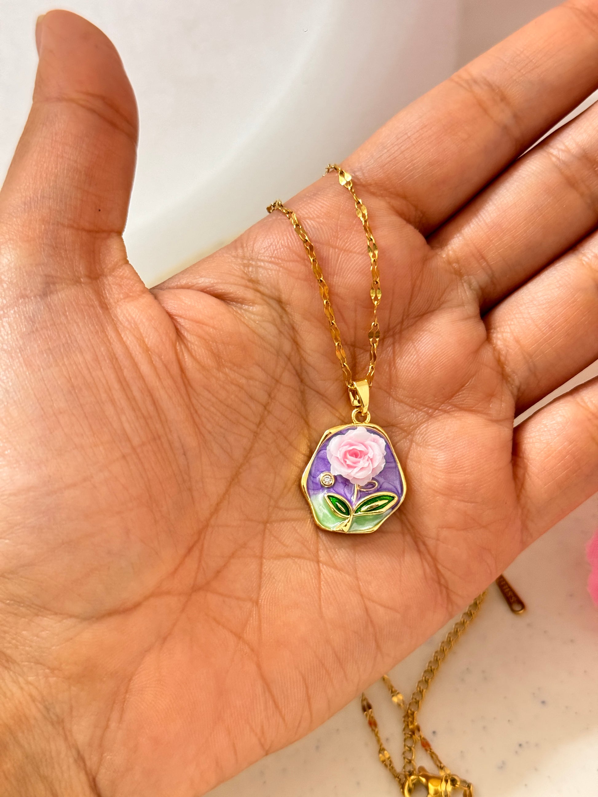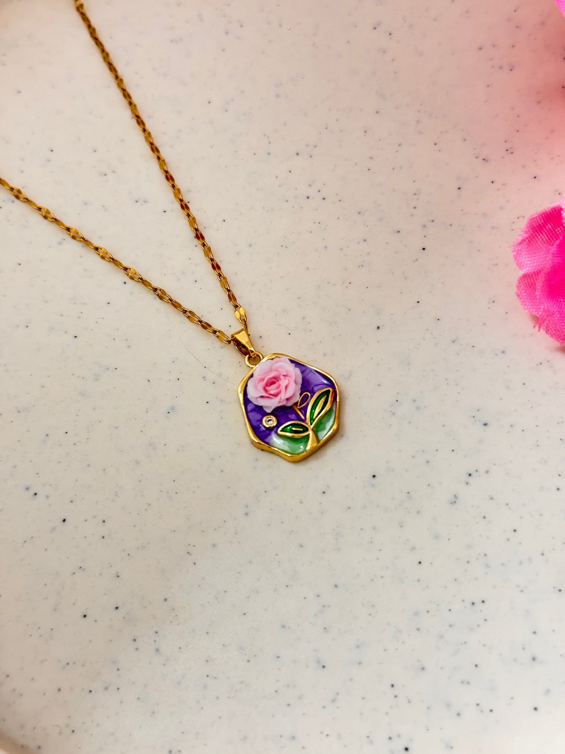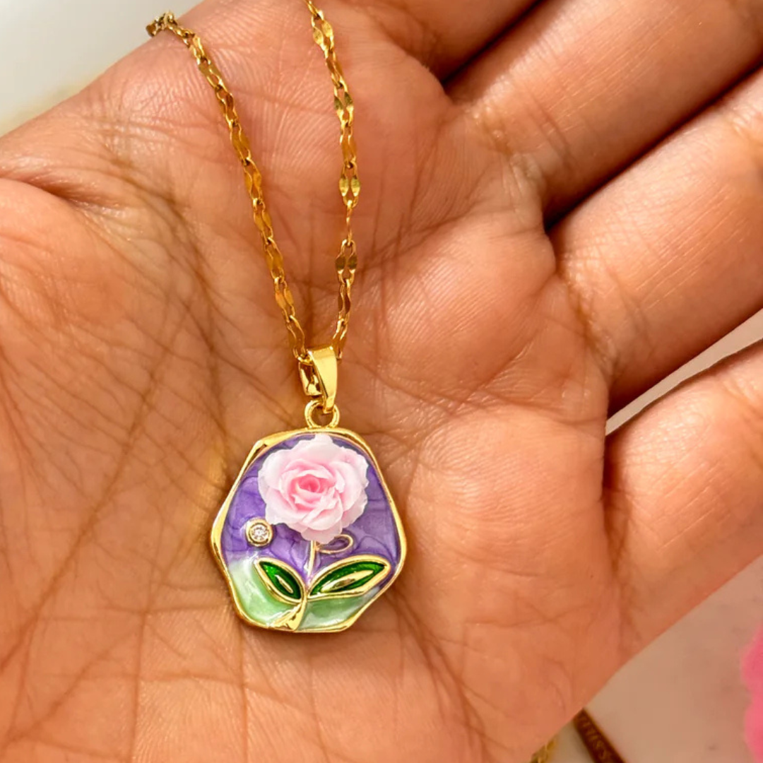 Enamel Rose Pendant Necklace – Gold Chain Floral Jewelry for Women